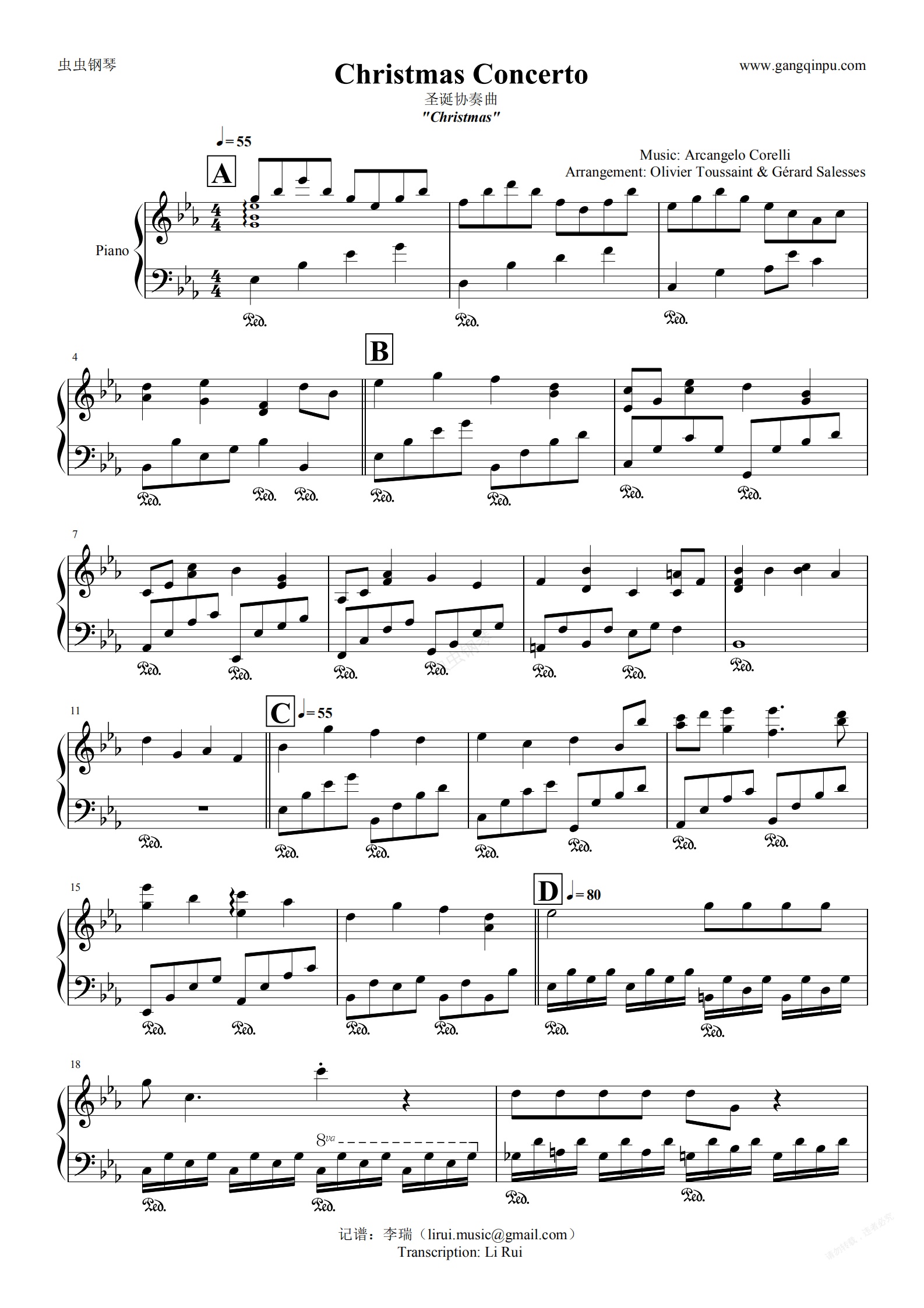 作曲:阿尔坎格罗·科莱里(),意大利小提琴家、作曲家。他的《12 首大协奏曲》(OP. 6)中第八首注明“为基督诞生之夜而作”,称为《圣诞节协奏曲》。理查德·克莱德曼演绎的钢琴版是由 和 Gérard 改编的。