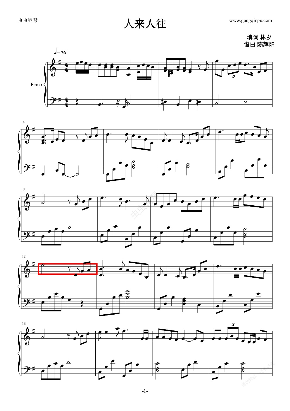 钢琴谱:人来人往