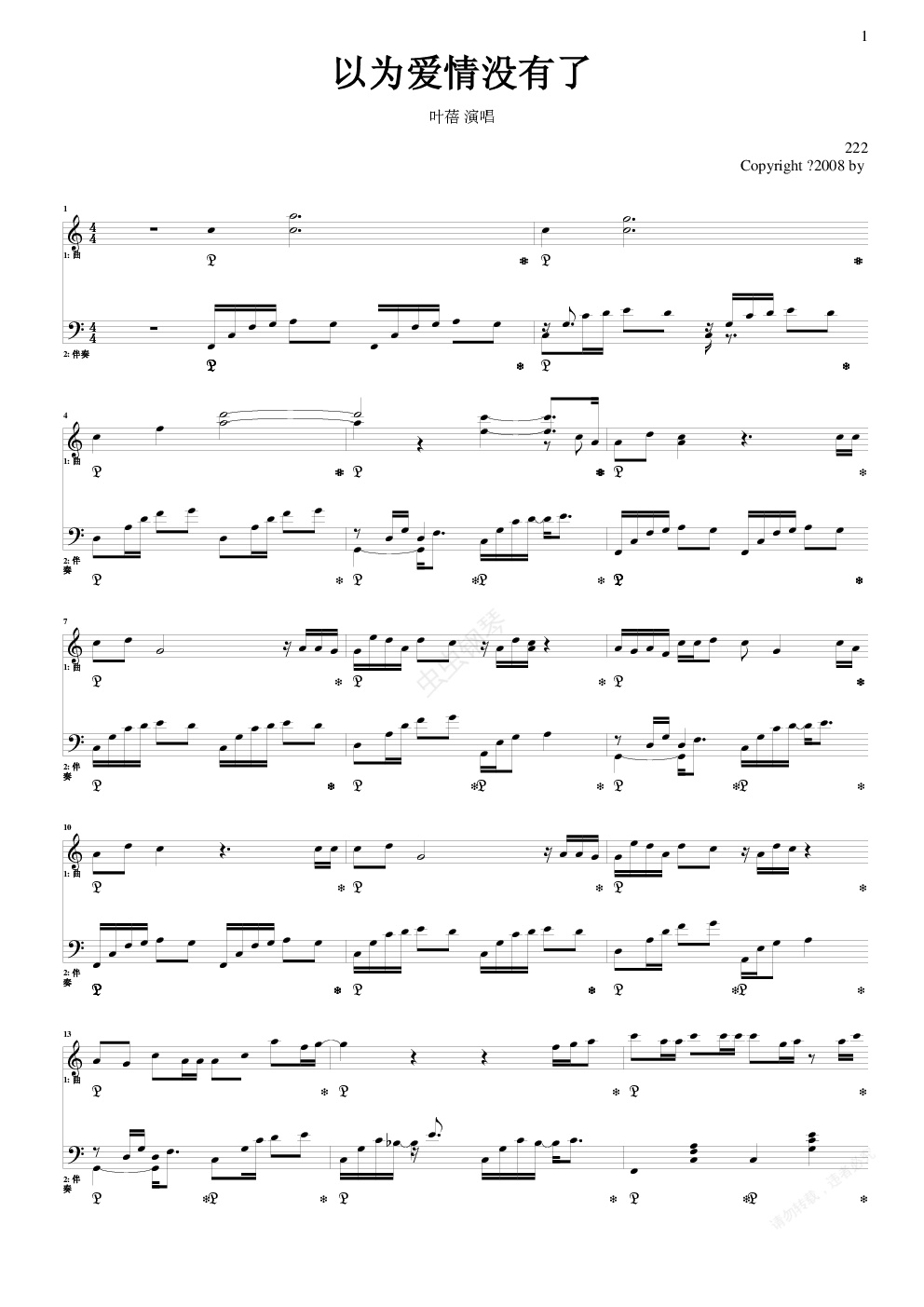 钢琴谱:以为爱情没有了