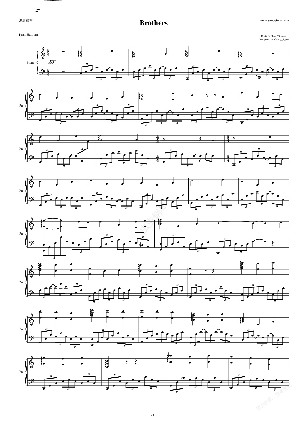 钢琴谱:Brothers(珍珠港)