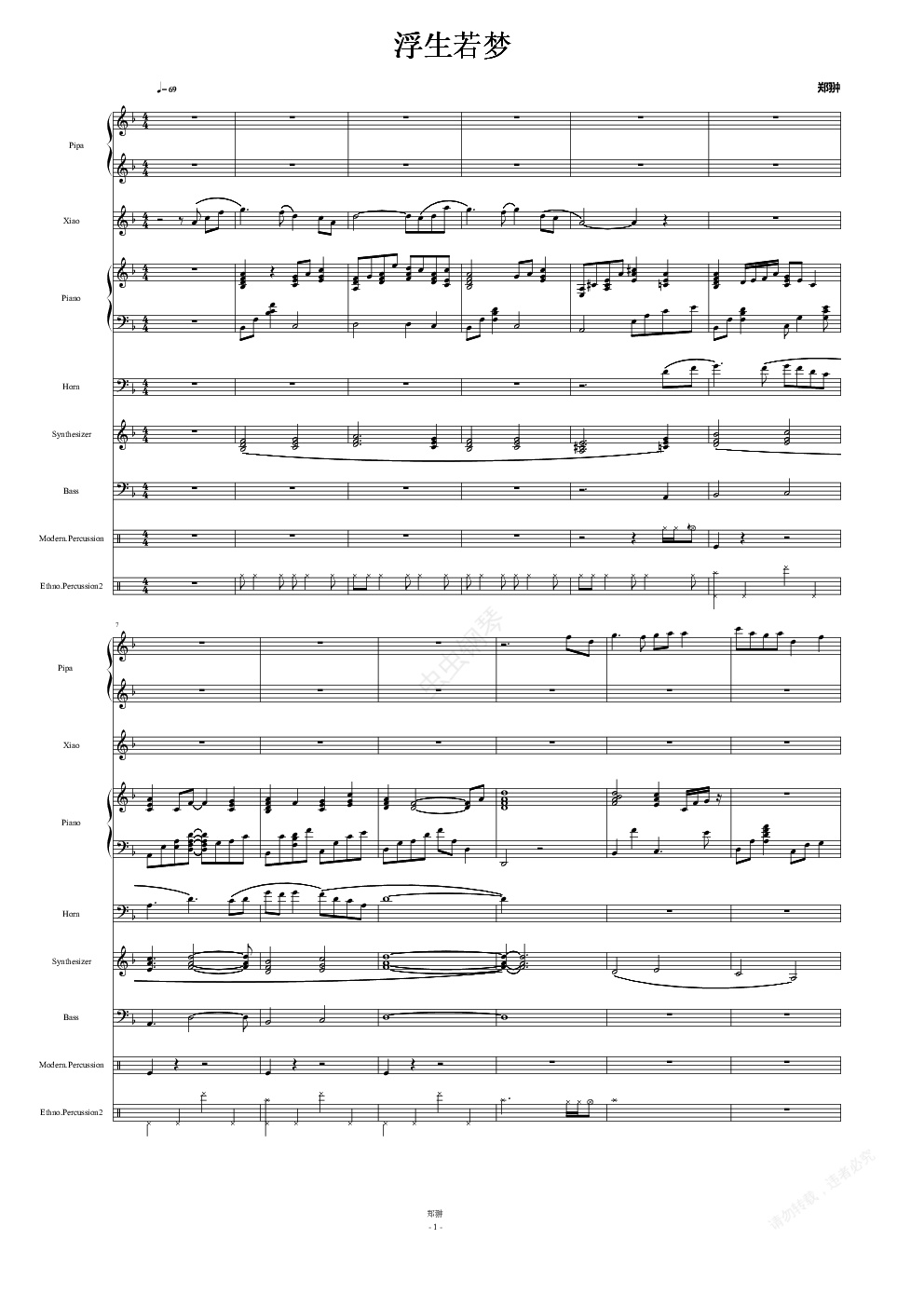 考虑到一些版权问题,所以曲谱阉割了交响乐声部,但保留电子部分,钢琴伴奏,琵琶和南萧独奏保留以供参考。望谅解。