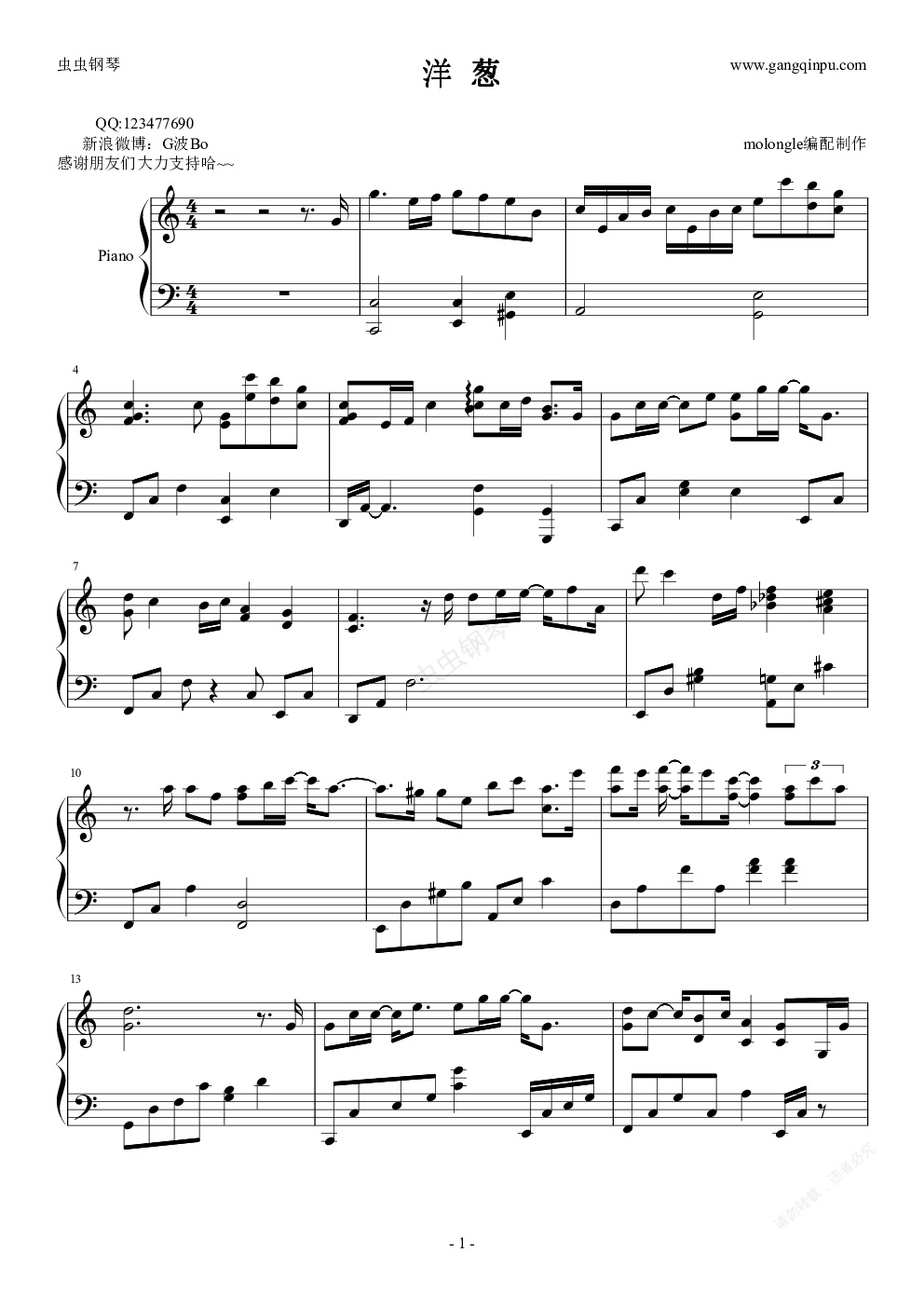 钢琴谱:独家编配《洋葱》钢琴演奏谱~