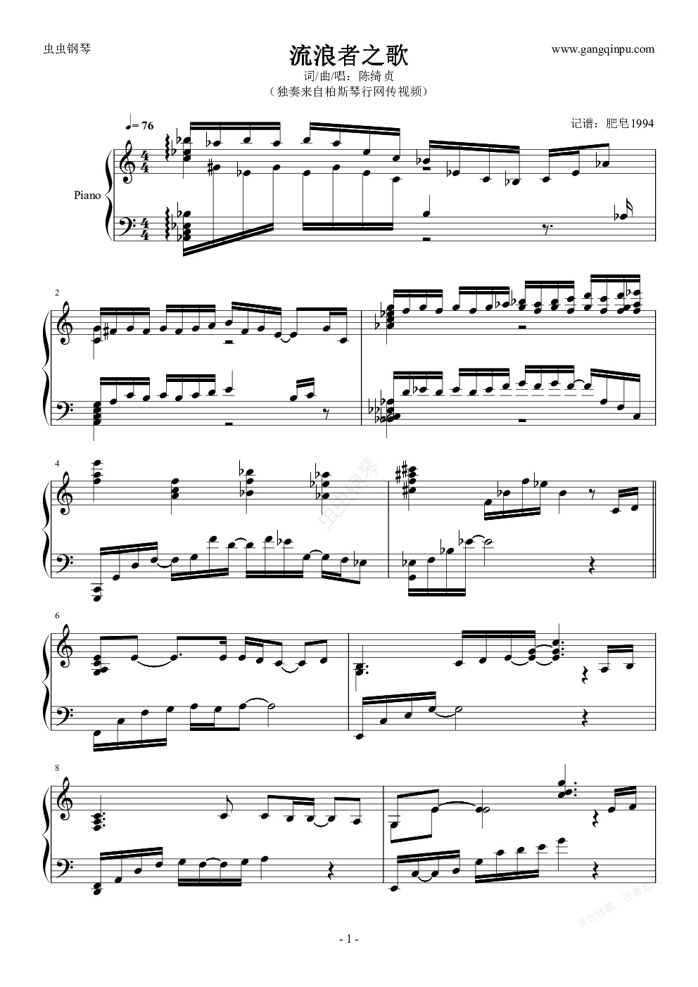 钢琴谱:陈绮贞-流浪者之歌(独奏)