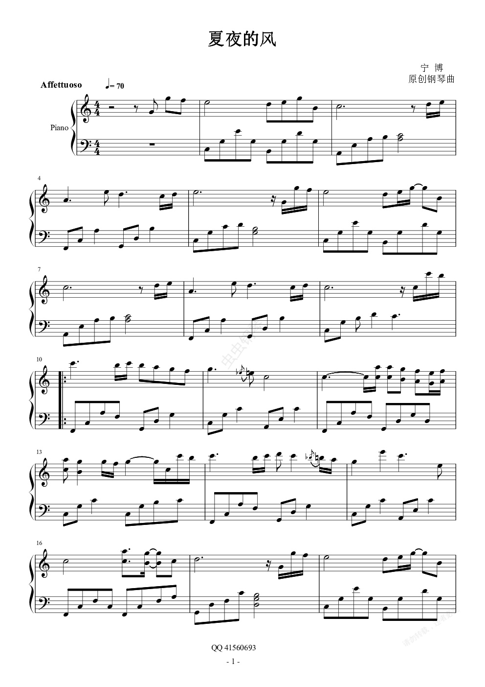 钢琴谱:夏夜的风