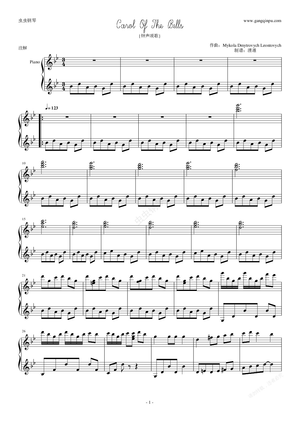钢琴谱:Carol Of The Bells(钟声颂歌)
