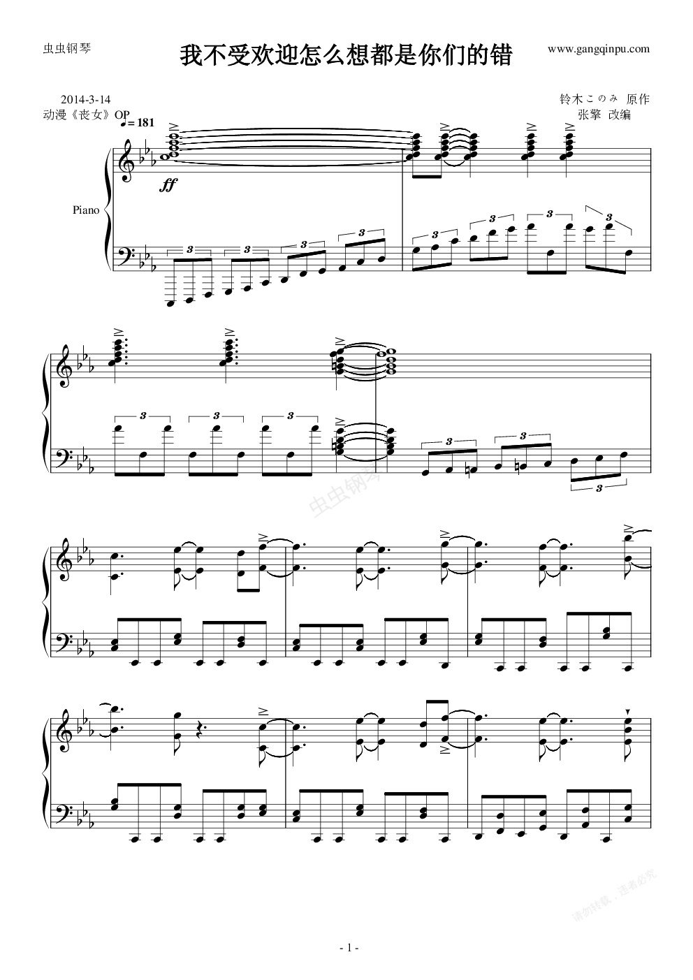钢琴谱:我不受欢迎怎么想都是你们的错