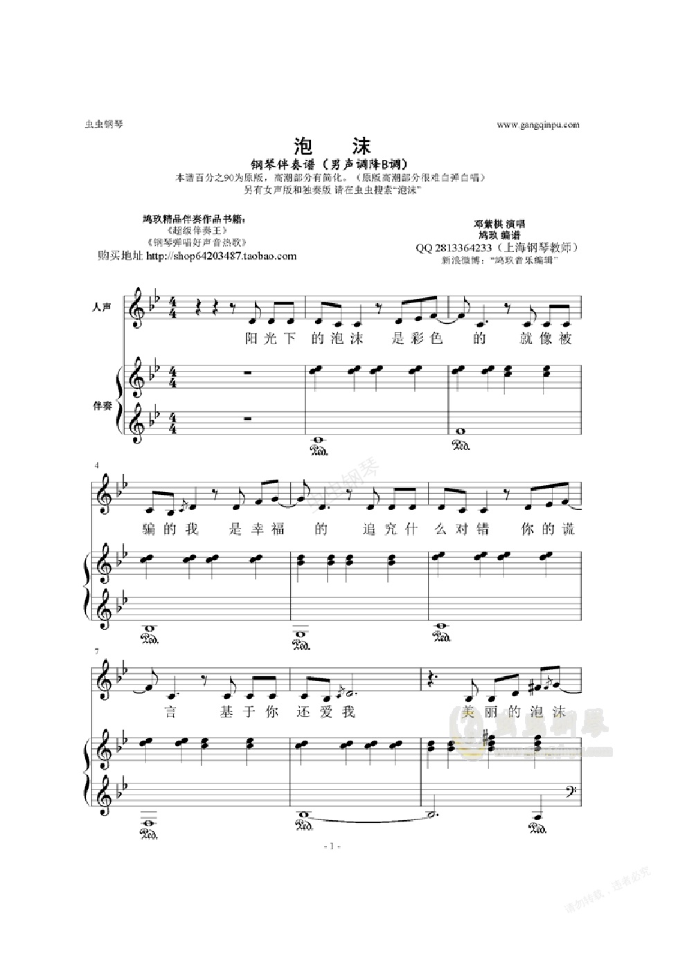 泡沫钢琴伴奏谱(男声降B调)