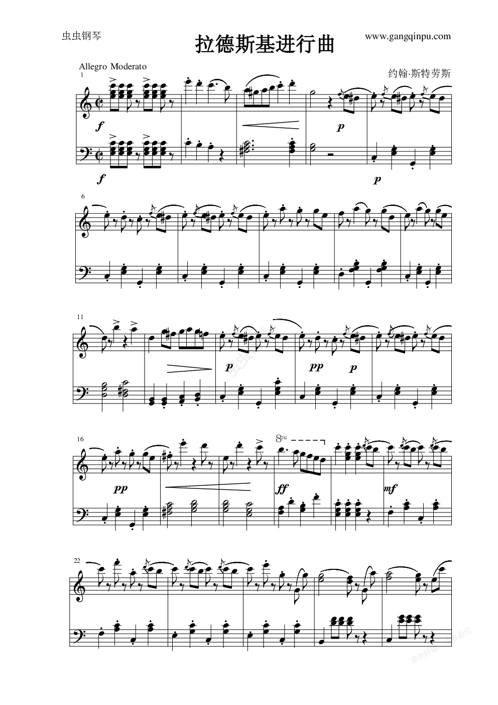 《拉德斯基进行曲》,管弦乐曲,老约翰·施特劳斯最著名的代表作,大概是世界上最为人们所熟悉的进行曲,经常作为通俗的管弦乐音乐会的最后一首曲目。每年著名的维也纳新年音乐会也总是以这首曲子作为结束曲,并已成为一种传统。但此曲有一个鲜为人知的背景:这首曲子本是老约翰·施特劳斯题献给拉德斯基将军的,但实质上拉德斯基是一个铁腕人物,曾残酷镇压了邻国的人民起义,可以说是一个反动军阀。后来,就连施特劳斯本人及其子小约翰·施特劳斯也不愿再演出这首进行曲。尽管如此,《拉德斯基进行曲》还是以其脍炙人口的旋律和铿锵有力的节奏征服了广大听众,成为流传最为广泛的进行曲。常见的版本还有为管乐队所作的改编曲。这里选用的是维也纳新年音乐会结束时《拉德斯基进行曲》的录音片段,为管弦乐曲。