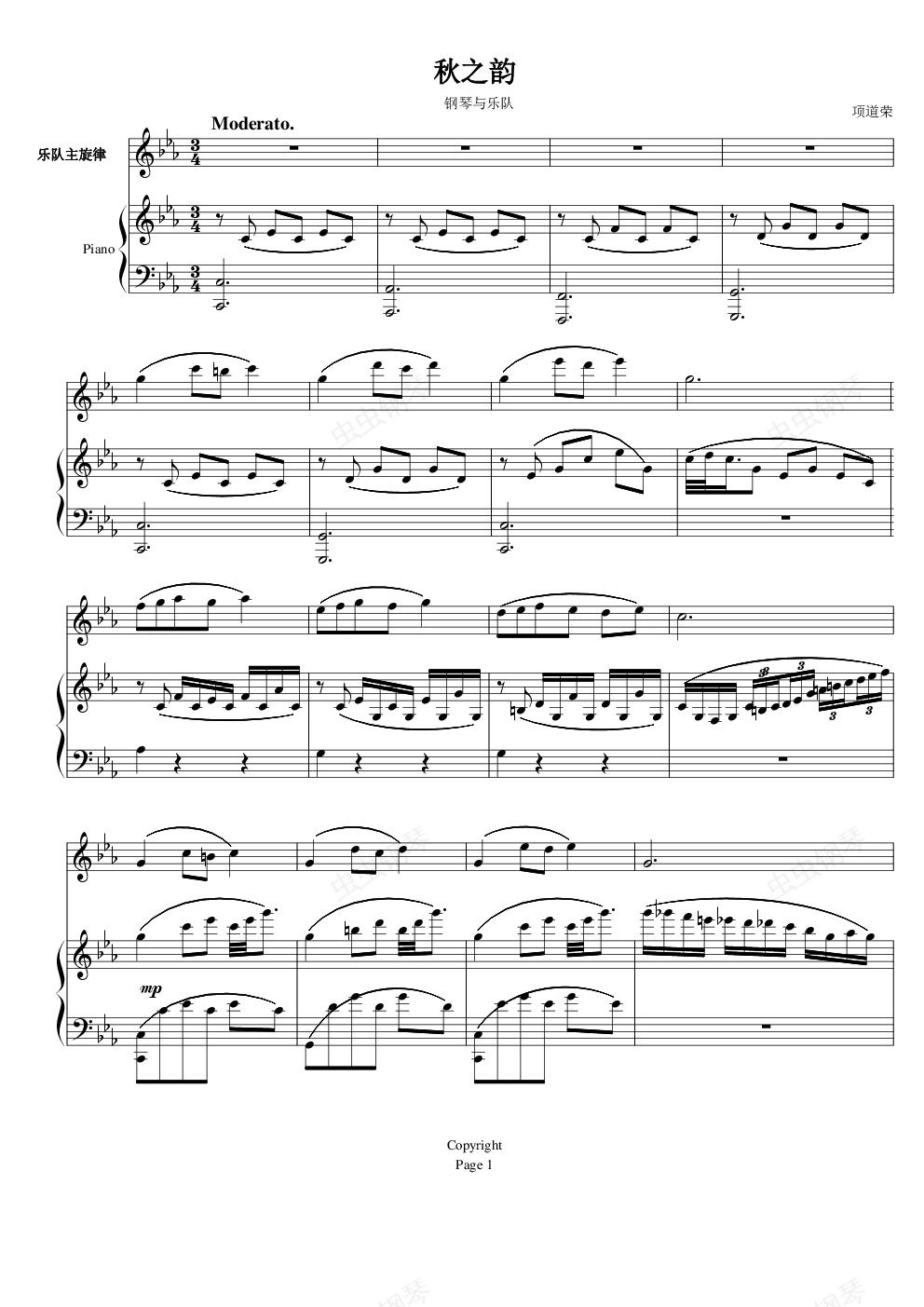 秋之韵,写于2010年秋。原来是在新浪博客看到博友写的一篇诗叫“秋雨,悄悄袭在了心上”,写得很是愁情满腹。我比较喜欢秋天,秋风、秋叶、秋雨,特别是秋高气爽,把夏日的炎热一扫而空,令人无限地怀旧,虽有伤感,也有幸福。所以很想写一小曲子,怀念昔日琴友。我不想把曲子写得那样“愁”,但有一点“惆怅”本是秋天的原色,而主要的感觉是“潇洒且愉快”。这样,在往日友人相聚以及别的美好时光不能够再来,所带来的遗憾,就潇洒而幸福地在回忆中,渐渐地消失。“秋之韵”就这样出来了。
