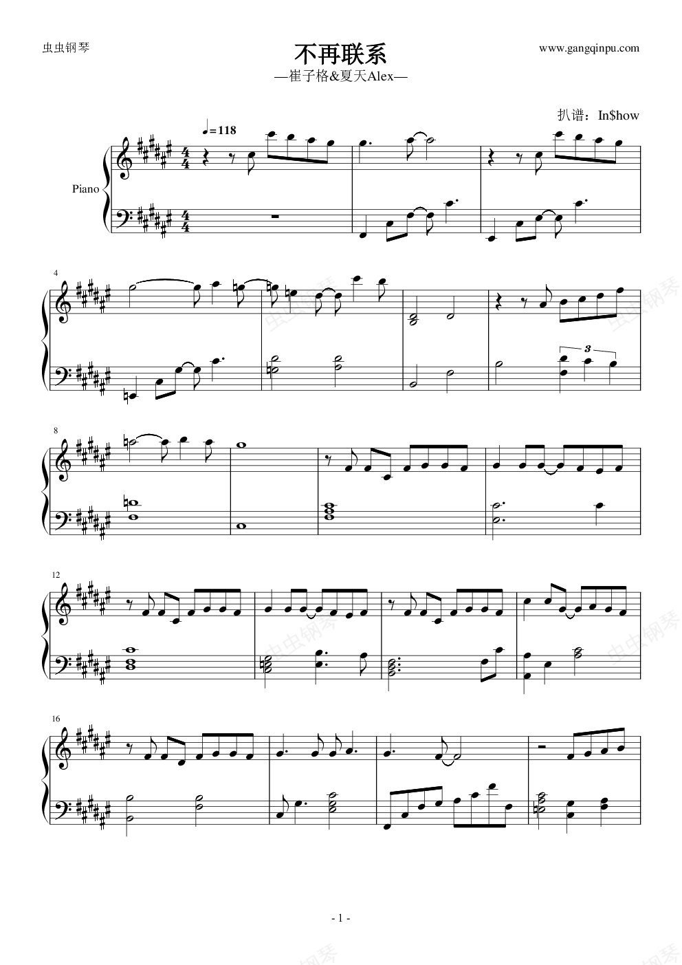 钢琴谱:不再联系- 崔子格&夏天Alex