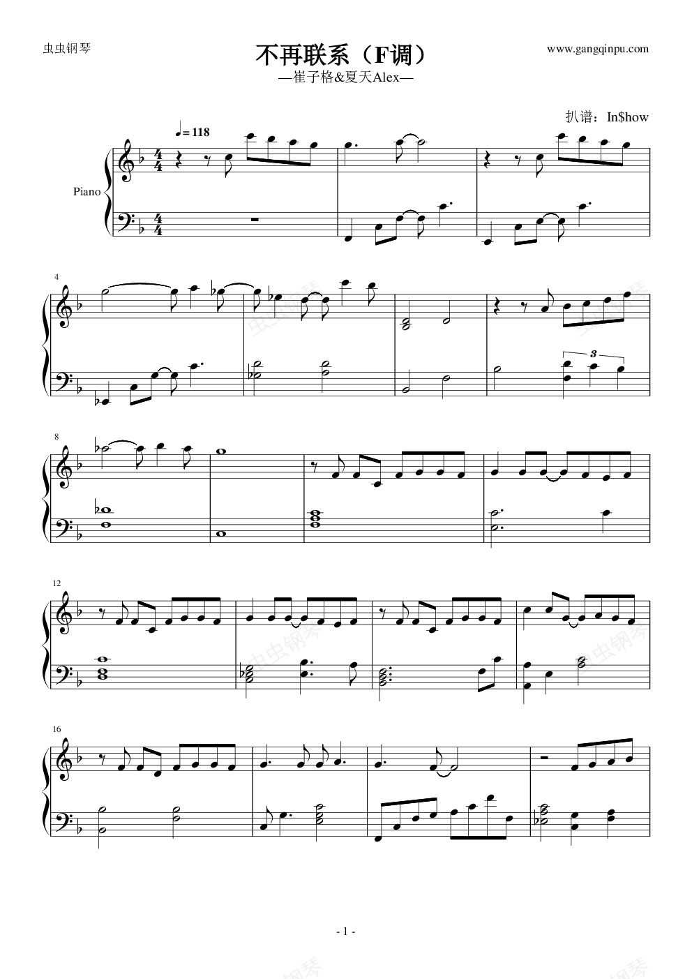 钢琴谱:不再联系(F调)-崔子格&夏天Alex