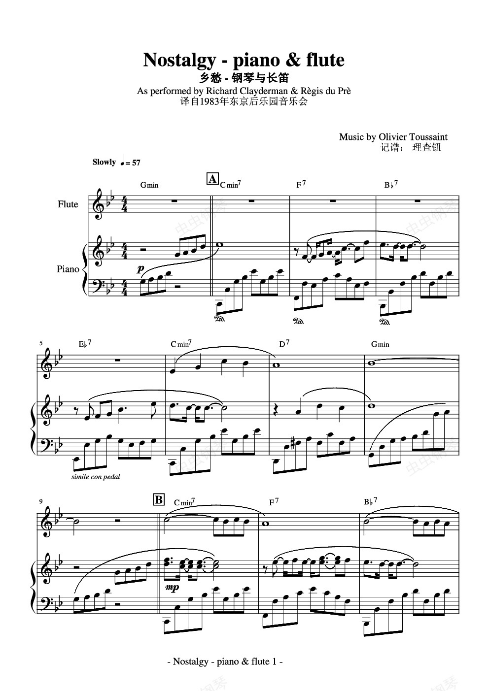《思乡曲》又译《乡愁》(法文《》),是理查德克莱德曼的一首经典曲目。市谱《思乡曲》为《 à ma mère (1985, )》专辑中的第11首《 ( piano et )》(一个短版)且还略有错误;我们最常听到的录音室版长版我在之前的日志中发过了(高潮部分钢琴转为琶音伴奏的那个);然而,我们知道,理查德克莱德曼先生在演奏会上所弹的又是另一个版本,这个版本的左手伴奏和录音室版长版相似(对比刚才所说的那个专辑中的短版),但是整体结构和录音室版长版不同,并且在往复出现的旋律中加了装饰,我们知道,老克在演奏会上演奏此曲的时候,通常他的乐队中的一位先生——就是一会儿担任指挥一会儿参与伴奏的那位会用长笛给老克伴奏,这在多次演奏会上都是很典型的一幕,让人印象深刻。本谱就是《思乡曲》演奏会版的钢琴与长笛合奏的“总谱”,是克迷界著名大神网友“理查钮”先生所做!很值得收藏!故推荐给大家。感谢理查钮!理查钮对理查德克莱德曼音乐的研究比我深得多,曾发表过很多珍贵的文章,再次感谢!