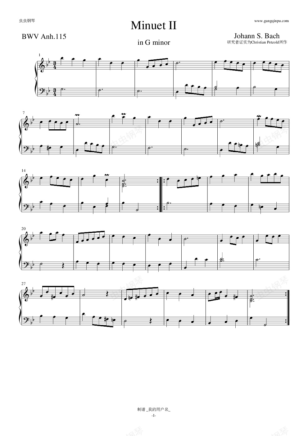 钢琴谱:G小调小步舞曲*巴赫BWV Anh.115