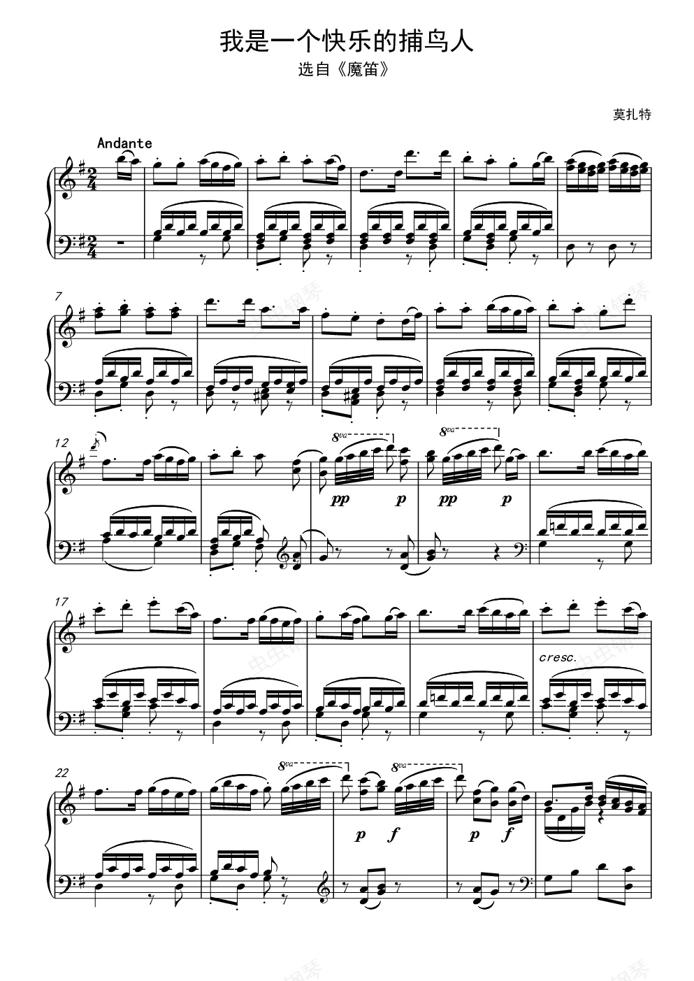 钢琴谱:我是一个快乐的捕鸟人——魔笛