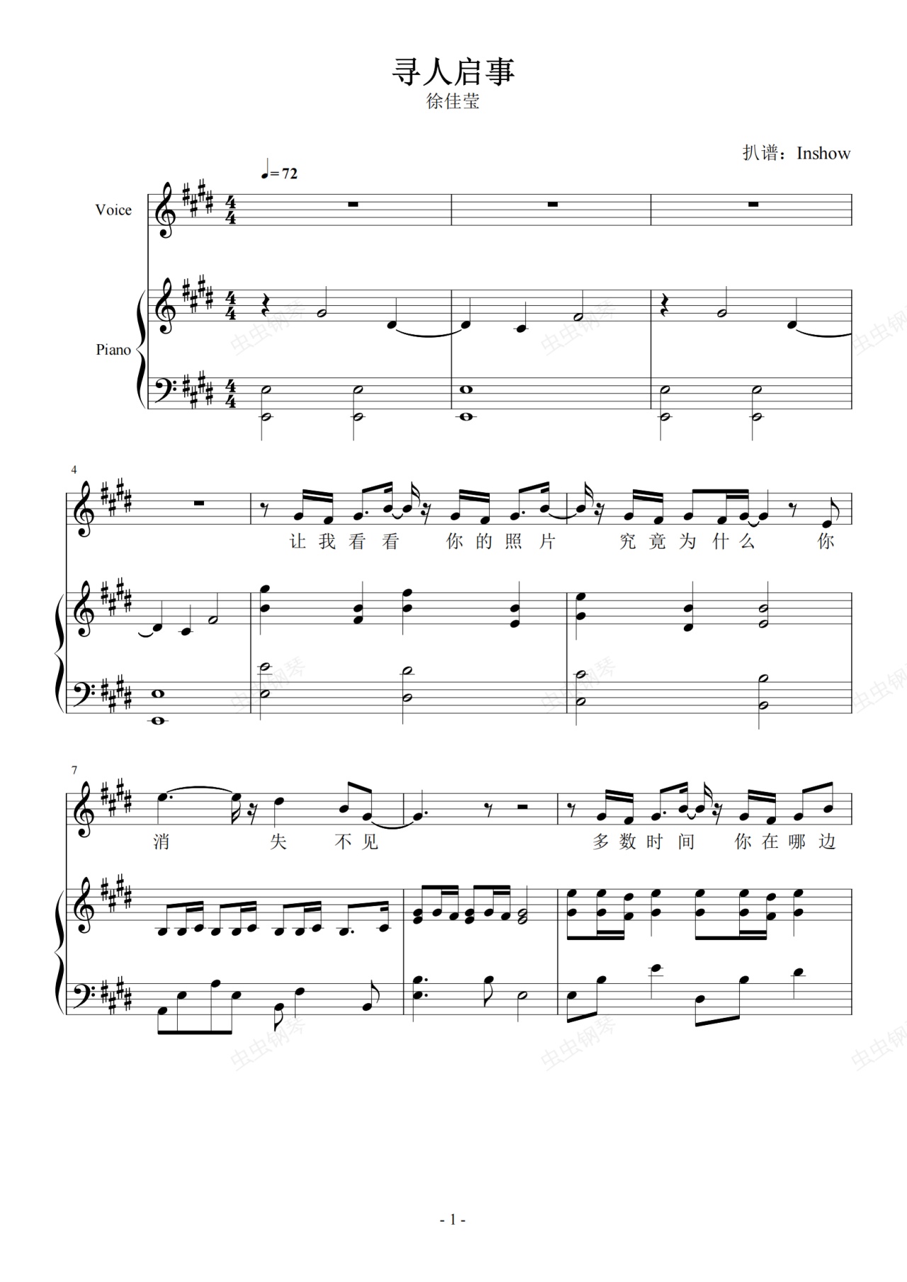 钢琴谱:(弹唱谱)寻人启事-徐佳莹