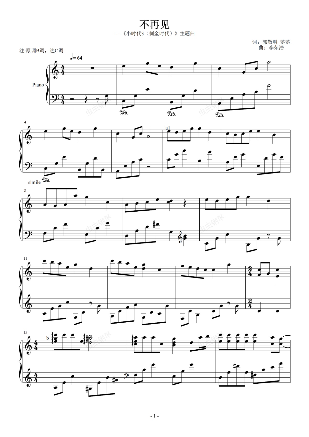 钢琴谱:不再见-小时代3(刺金时代)》主题曲