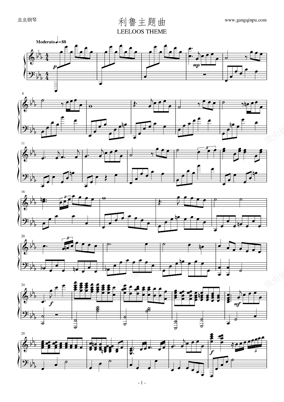 钢琴谱:LeeLoos Theme 利鲁主题曲 - Maksim 马克西姆