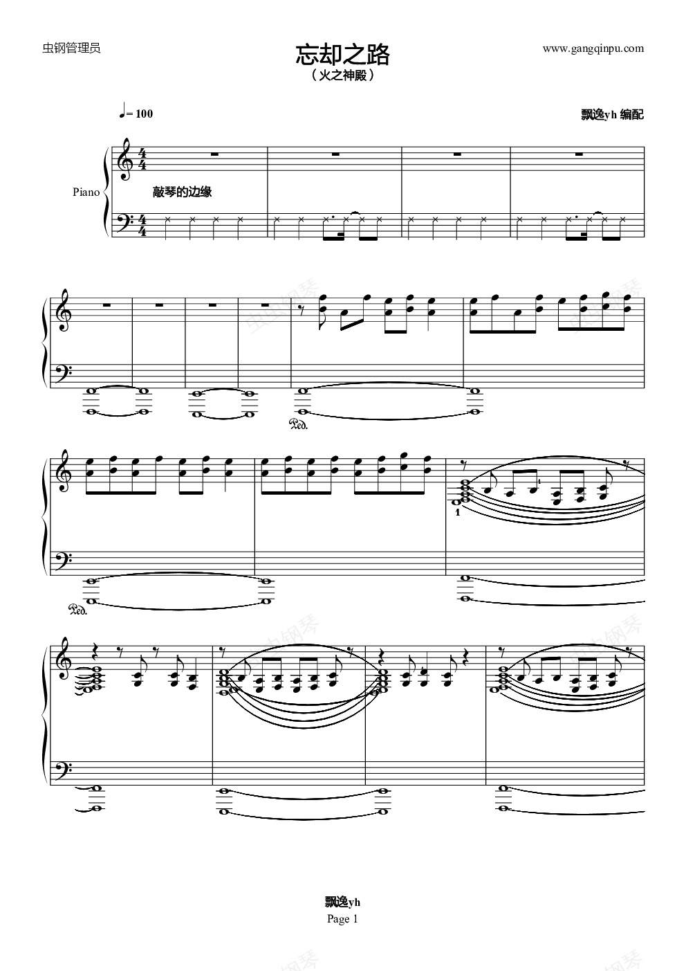 ★下载试听(原版及钢琴版)MP3请移步我的网盘,/e1310★【打印】请点击下方的“下载PDF乐谱”来打开PDF格式乐谱打印,否则字和音符都不是特别清楚★中声部的大多数和弦全部用踏板保持,有三角钢琴的壕们请尽情使用中踏板。有问题可以Email我—————————————————————————————————————————————忘却之路应该是不少人最熟悉的地方吧...科技党这首背景音乐乍一听很难听,但是越听越上瘾有木有!时间神殿系列背景音乐每一首速度都一样,即1分钟100拍,每一首都以神殿主旋律为主题变幻出不同的篇章且风格都不同。