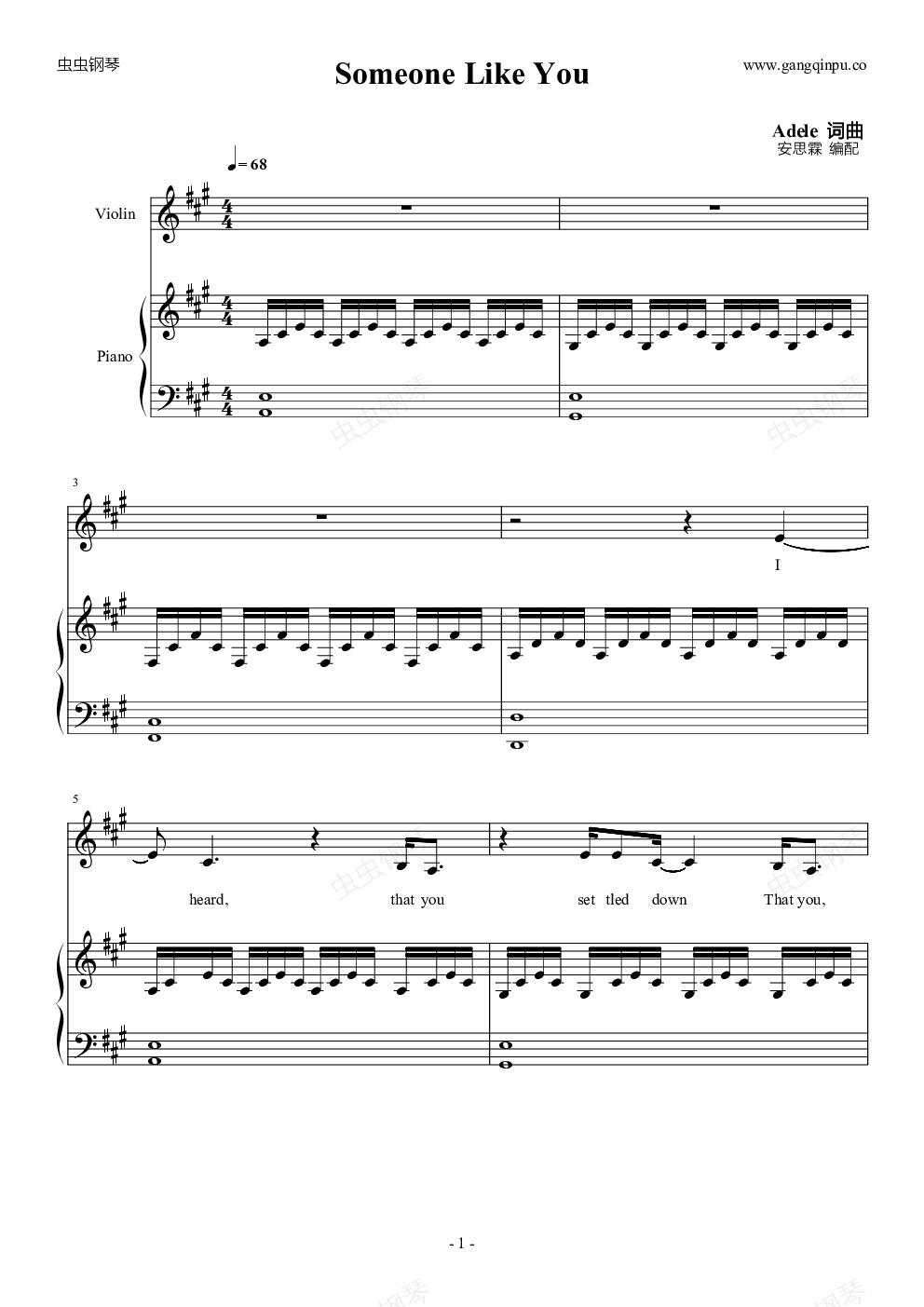 钢琴谱:someone like you(原版)小提琴钢琴伴奏