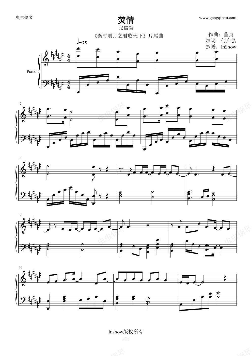 钢琴谱:焚情-《秦时明月之君临天下》片尾曲-张信哲