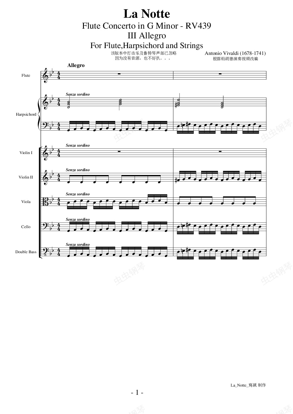 钢琴谱:维瓦尔第 长笛协奏曲 RV439 夜 La Notte 第三乐章