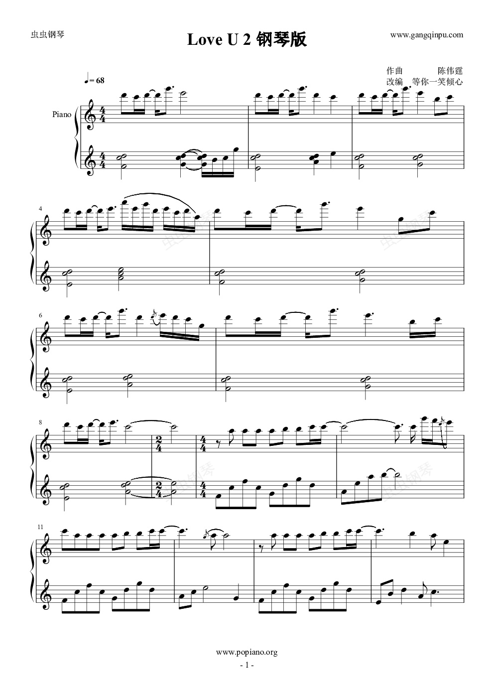 钢琴谱:Love U 2 钢琴版