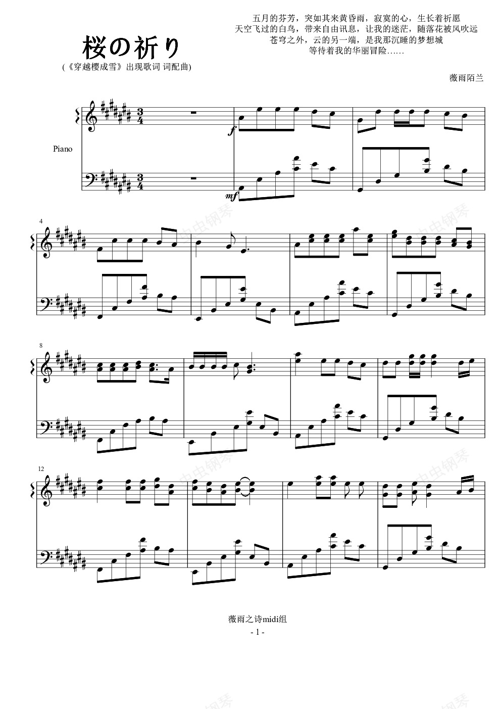 钢琴谱:【薇雨陌兰】桜の祈り (穿越樱成雪漫画词配曲)