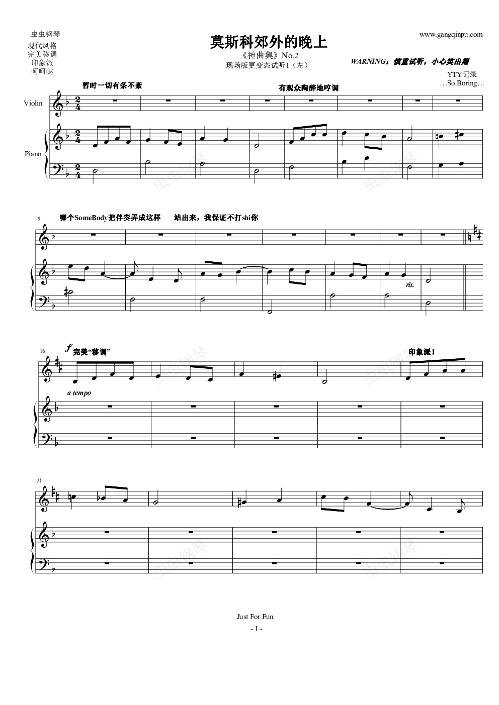 莫斯科郊外的晚上是最有国际影响力的苏联歌曲之一。如此浪漫的曲子却毁在了一场文艺晚会上,女主忘谱依旧从容淡定,干脆破罐子破摔,硬生生地将d小调变成b小调,又移调为降E大调,最后从容不迫地回到主调。伴奏手拒不配合,依旧坚持d小调,所以上演了一场“和谐”的《莫斯科郊外的晚上》。我第一次彻底毁了音乐,竟然把谱打了出来。这个事件告诉我们:小提琴拉不好就不要出来展示唉!