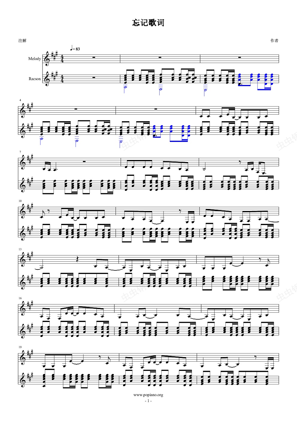 钢琴谱:忘记歌词