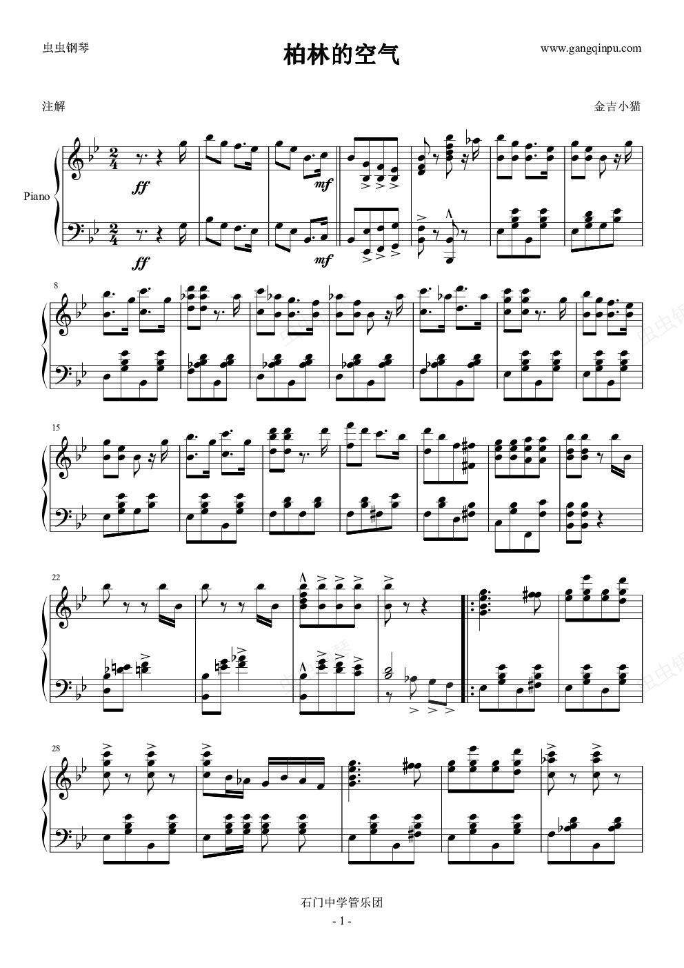 维也纳新年音乐会演奏的是著名的《拉德斯基进行曲》,而柏林森林音乐会演奏的是让全体柏林人最引为自豪的《柏林的空气( Luft)》。这是由有“德国的斯特劳斯”之称的作曲家保罗"林克(Paul")(1866 ~1946) 1902年创作的一首标志性歌曲。这首歌曲不仅音乐优美、富有节奏感,而且其意境也令柏林人情有独钟。这是因为柏林有着特殊的城市品位——整座城市环抱在郁郁葱葱的森林之中,绿地与公园遍布市区。特别在城区的西半部,森林占地3150公顷,辟有泰格尔、施潘道、格鲁讷瓦尔德三大森林区。正是这得天独厚的优美环境,特别是清新的空气,使得柏林人的生活感到无比惬意和舒适。“那是柏林清爽的空气,如此奇妙的芬芳,永久保持着它生命的活力,那就是柏林神奇的空气;那是柏林怡人的空气,永久保持着它生命的活力,那就是柏林神奇的空气;那就是柏林怡人的空气,”这部曲调轻松、节奏热烈、情绪欢快的作品,恰到好处地表现了柏林人乐观向上的天性,也体现了他们对美好生活和大自然的真情赞美,深受人们的喜爱。就如同柏林市歌一样,这首《柏林的空气》在许多重大的场合和节庆音乐会中演奏。每当柏林森林消夏音乐会在最后演奏到这首乐曲时,全场观众的情绪也被带到热烈的顶点。全场观众起立,随着激荡的音符和跳跃的节奏,或歌唱、击掌应和,或欢呼起舞,此时指挥和乐队也总是以不同的形式表演一些令人忍俊不禁的噱头,惹得全场观众开心大笑,整个剧场仿佛是一个欢乐的海洋。最令人心动的是,观众席中点燃的一束束小烟花,一盏盏小蜡烛,以及随着音乐节奏打着响彻全场的口哨摇摆跳荡的欢乐人群,构成了森林音乐会的特殊魅力,使人们忘情地融入音乐所给人带来的无限欢乐之中。