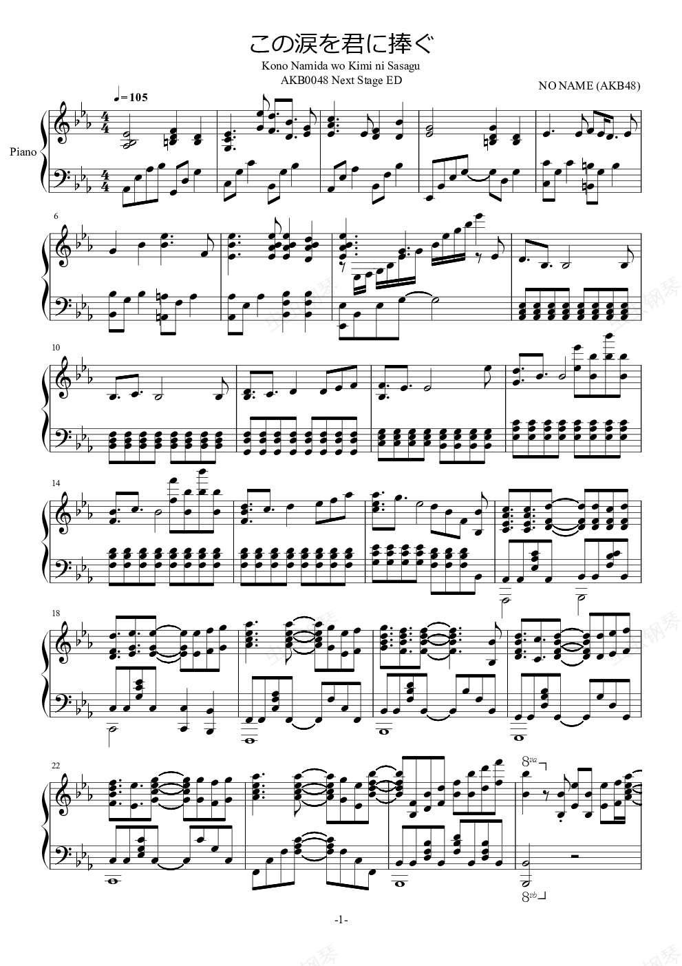 钢琴谱:【AKB0048 Next Stage】 ED 将泪水献给你 (完整版 Full ver.)(Kono Namida wo Kimi ni Sasagu この涙を君に