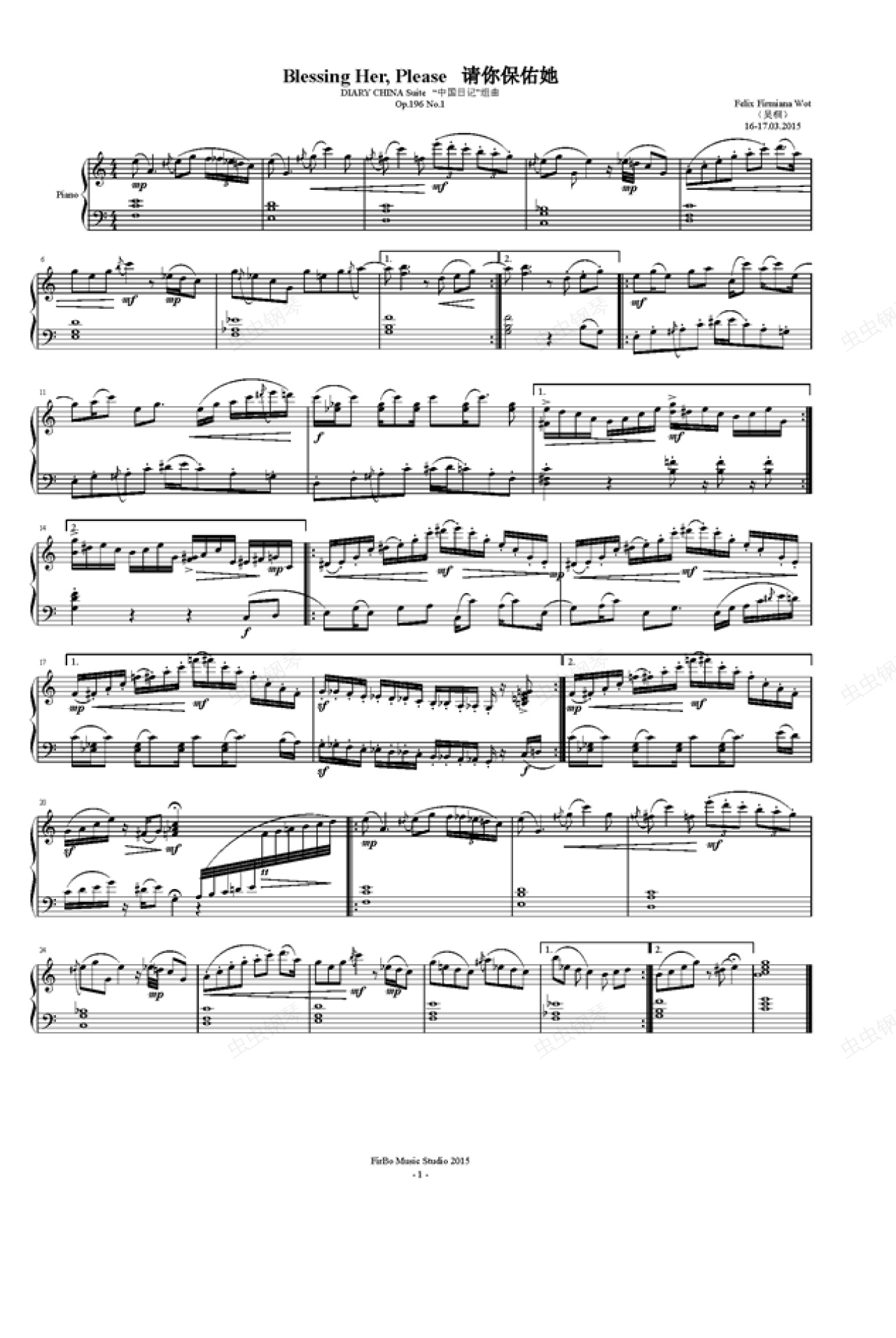 钢琴谱:《中国日记》No.1 请你保佑她