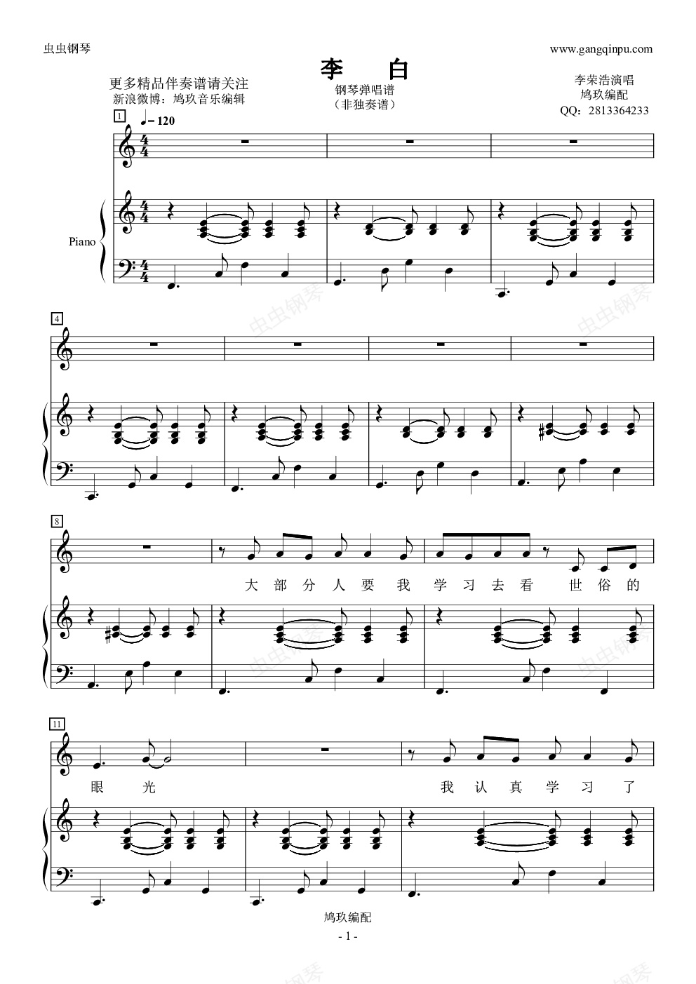 李白(钢琴弹唱谱李荣浩)鸠玖版