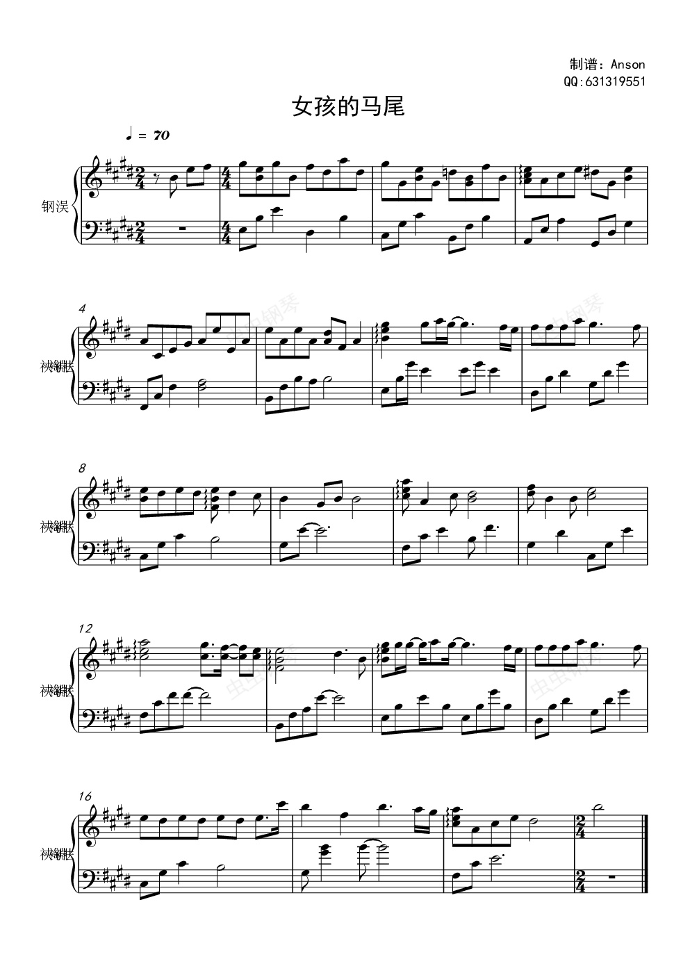 钢琴谱:女孩的马尾