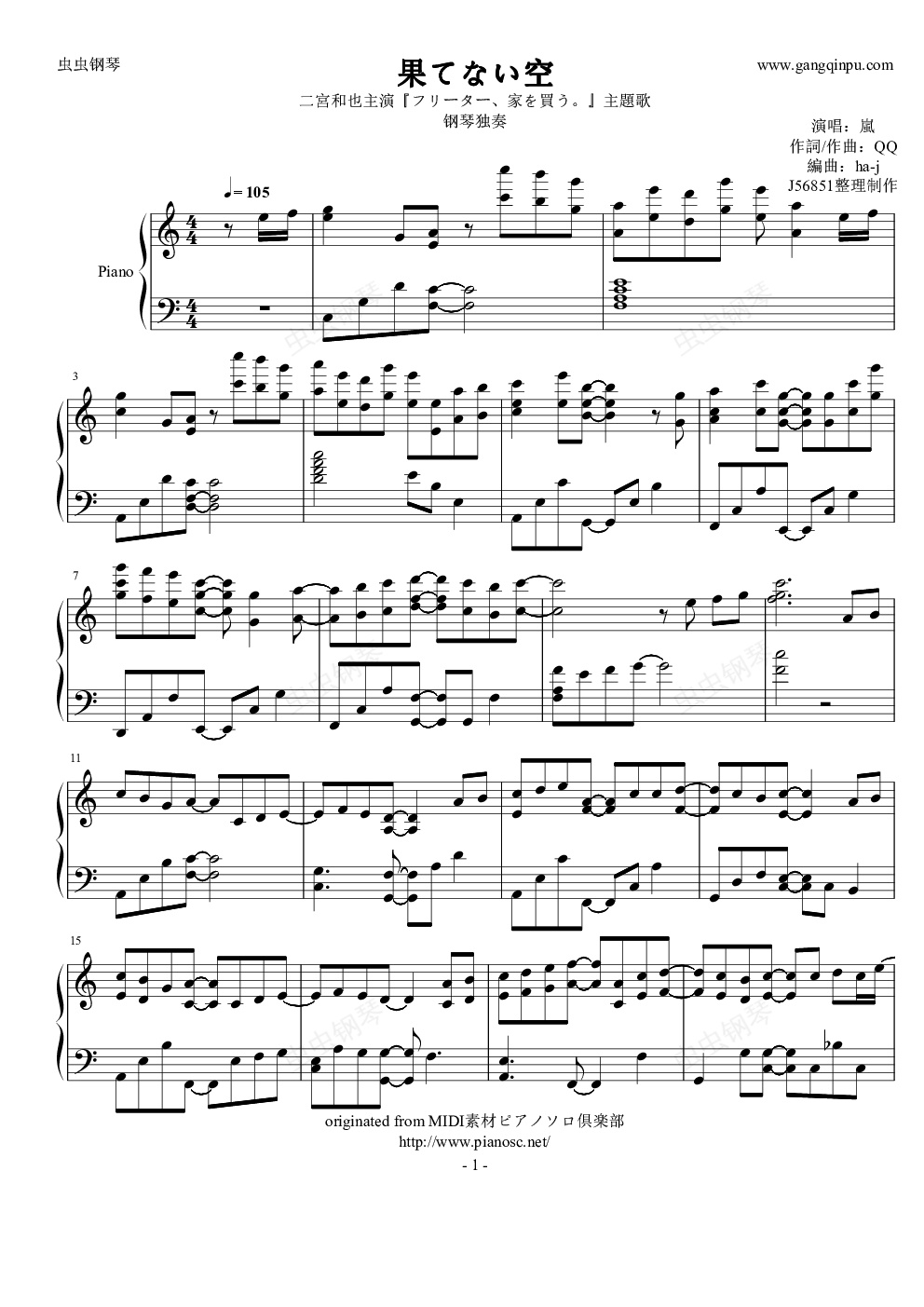 钢琴谱:嵐 - 果てない空