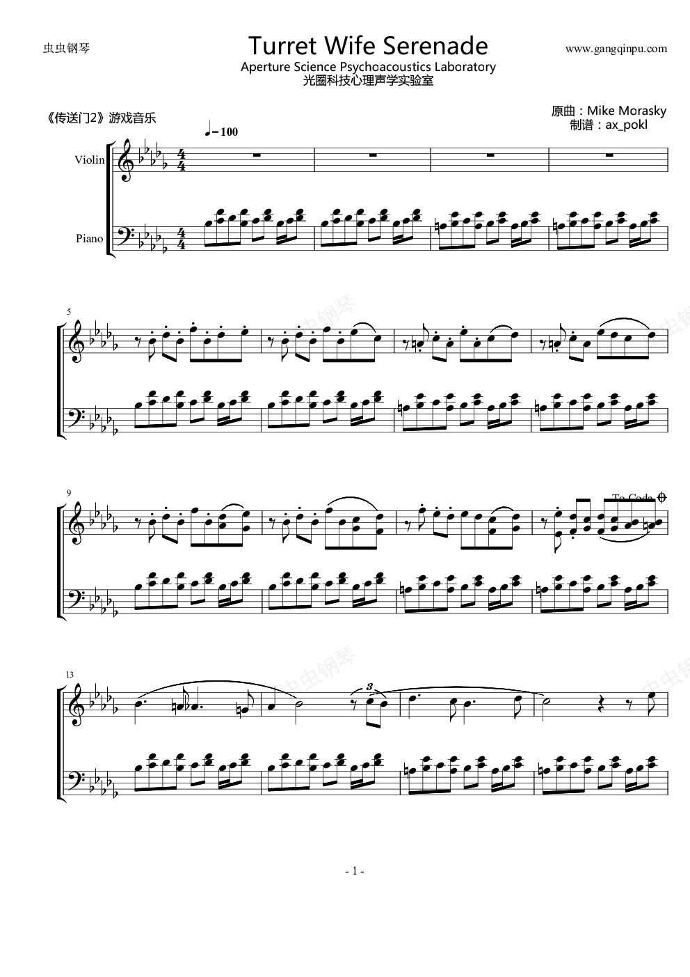 钢琴谱:Turret Wife Serenade(传送门2)