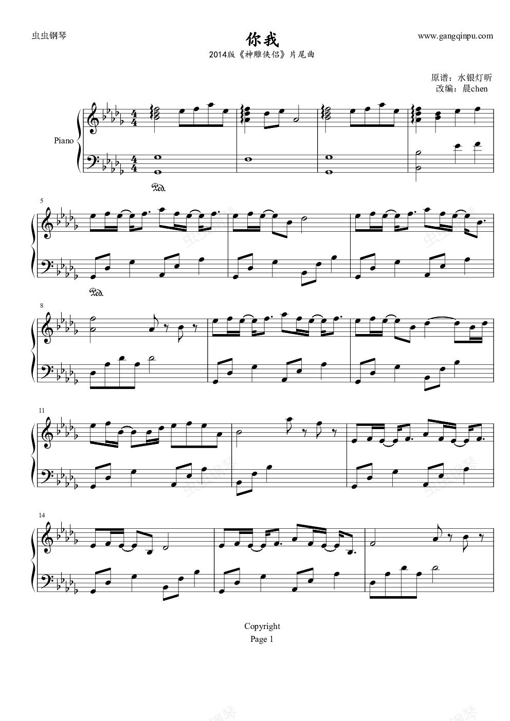 钢琴谱:你我-2014版神雕侠侣片尾曲