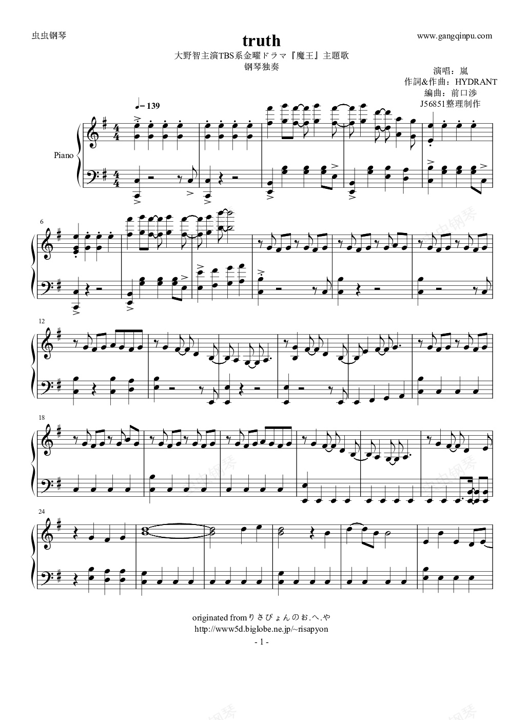 钢琴谱:嵐 - truth