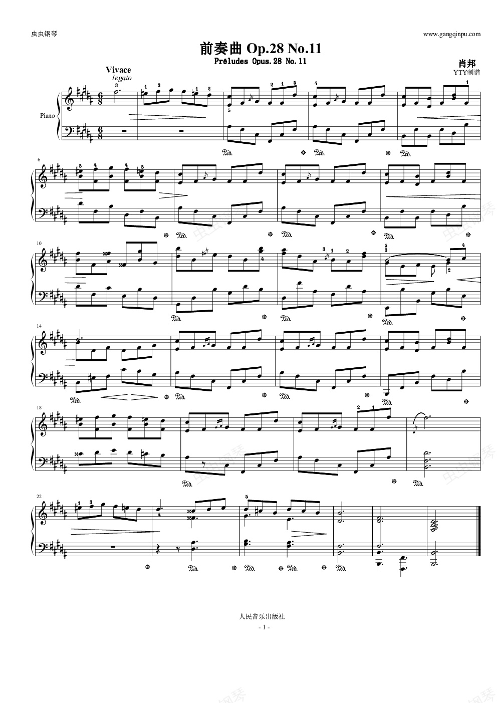 钢琴谱:B大调前奏曲 Op.28 No.11 带指法、踏板