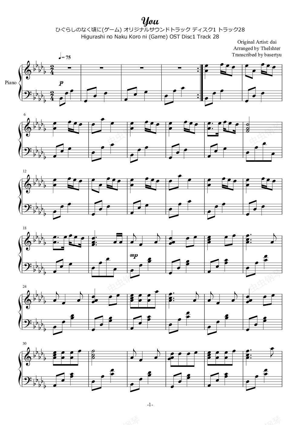 钢琴谱:寒蝉鸣泣之时 you (TheIshter)(Higurashi no Naku Koro ni ひぐらしのなく頃に OST)(T叔版本 Arranged by T