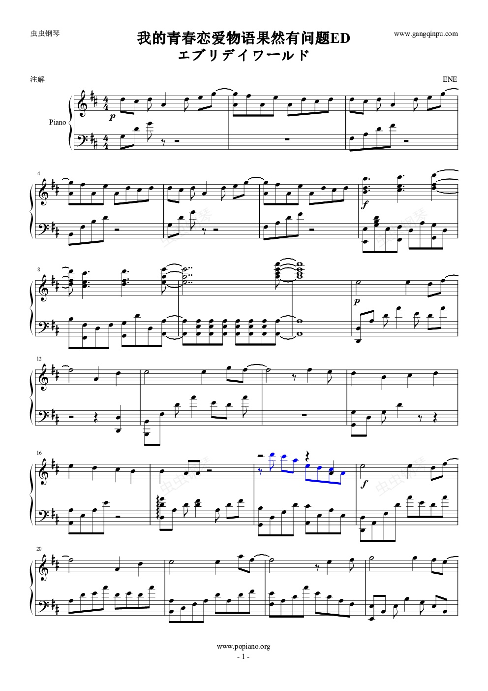 钢琴谱:【ENE】我的青春恋爱物语果然有问题EDエブリデイワールド