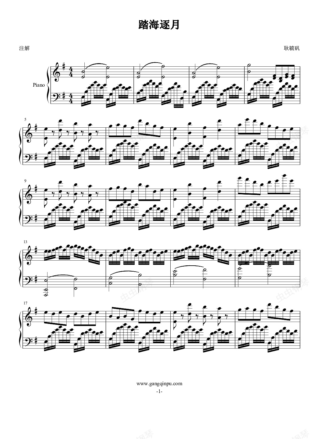 因为是新手,所以作品中有许多重音,被死党罗嗦了很多次,这首曲子十六分音符比较多,所以整首曲子的氛围也比较快,建议用耳机听,嘿嘿,主要是本人还不会谱写节奏慢的曲子,名为踏海逐月,其实做出曲子也希望给在环境中不断奋斗,不断向前的人们一种慰藉,其中大量的快速音符表示那些不得不面对的烦恼和问题,和要解决时的很low的心情,但是右手部分的快速也是很愉悦的,新手作曲,多有复制,谢谢欣赏。