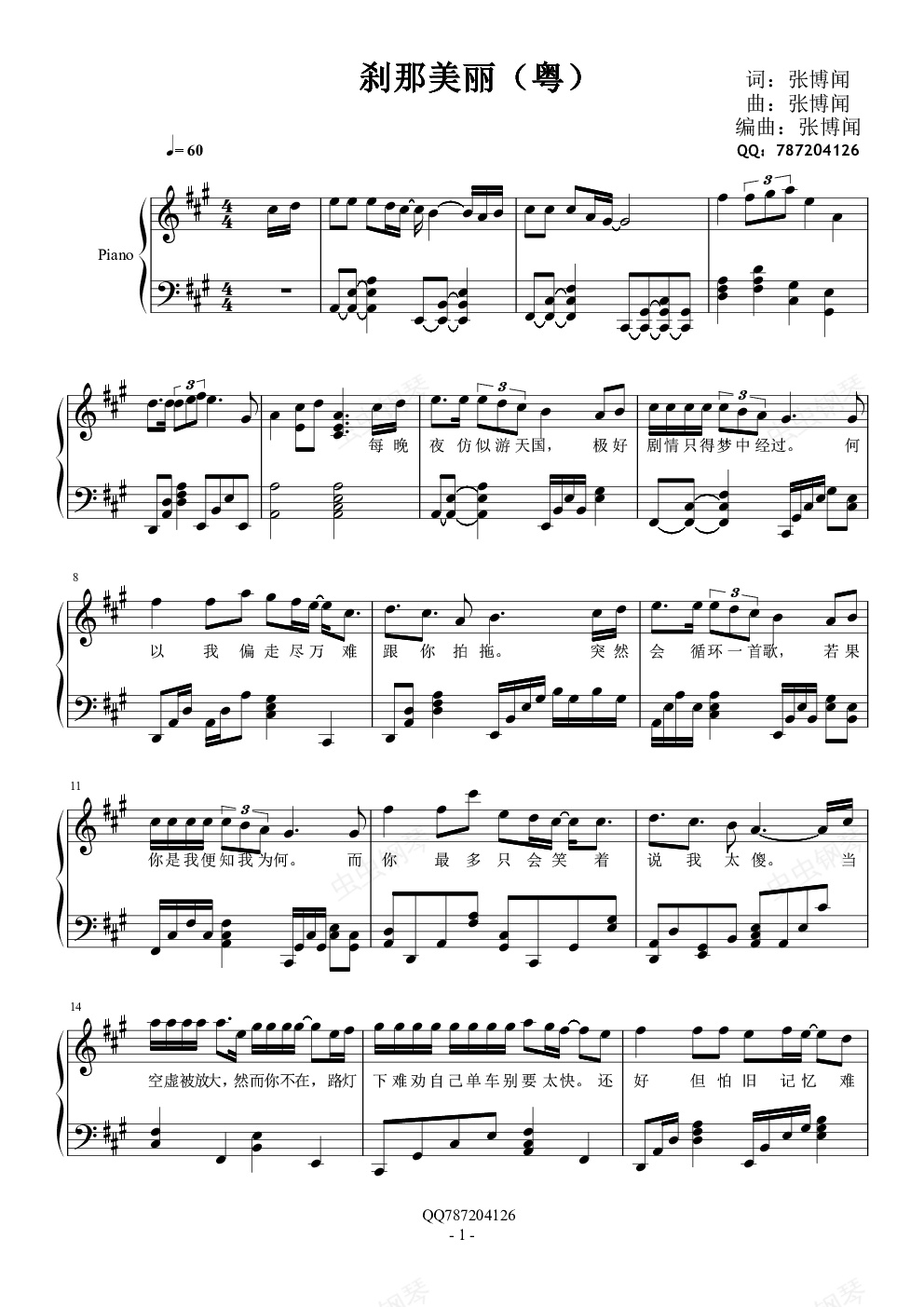 钢琴谱:刹那美丽(粤语)(原创歌曲)