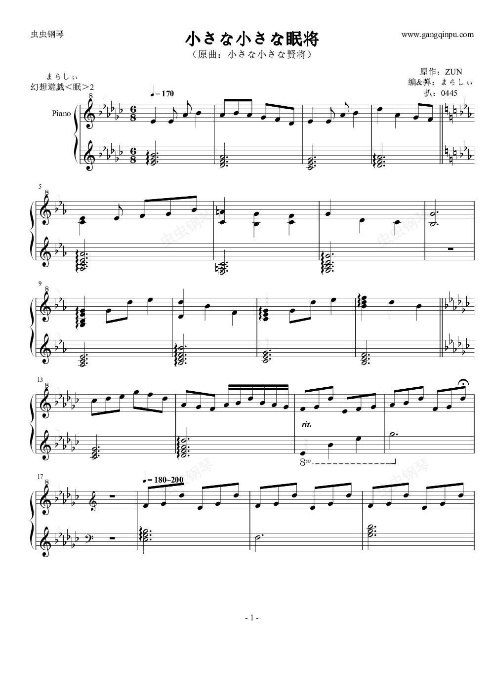 钢琴谱:【东方】【触手猴】小さな小さな眠将