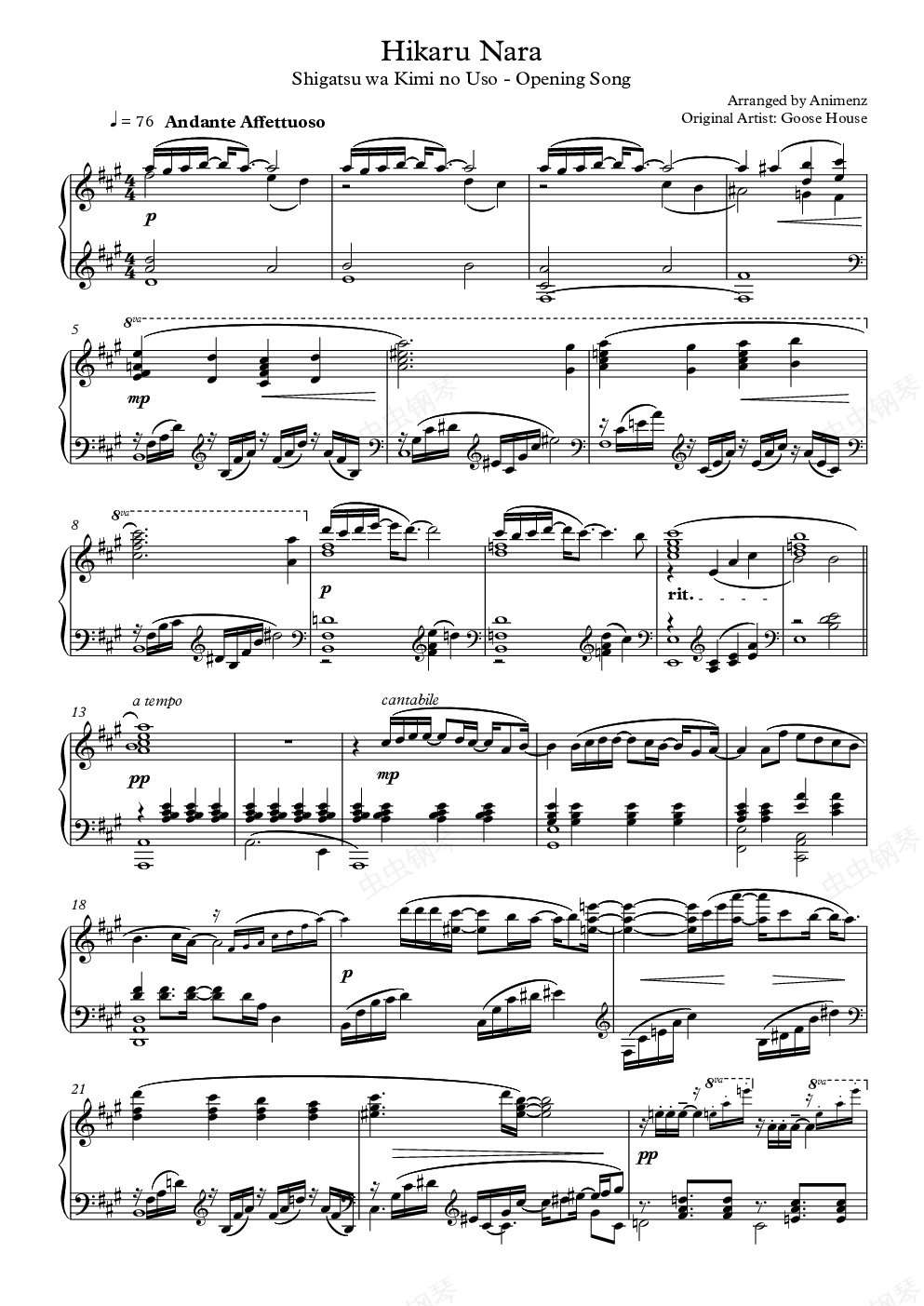 钢琴谱:【Animenz】光るなら 四月是你的谎言 OP