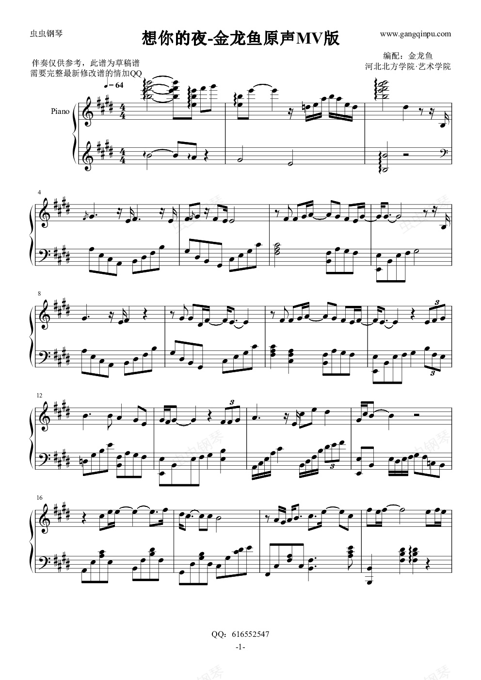钢琴谱:想你的夜钢琴独奏-金龙鱼版
