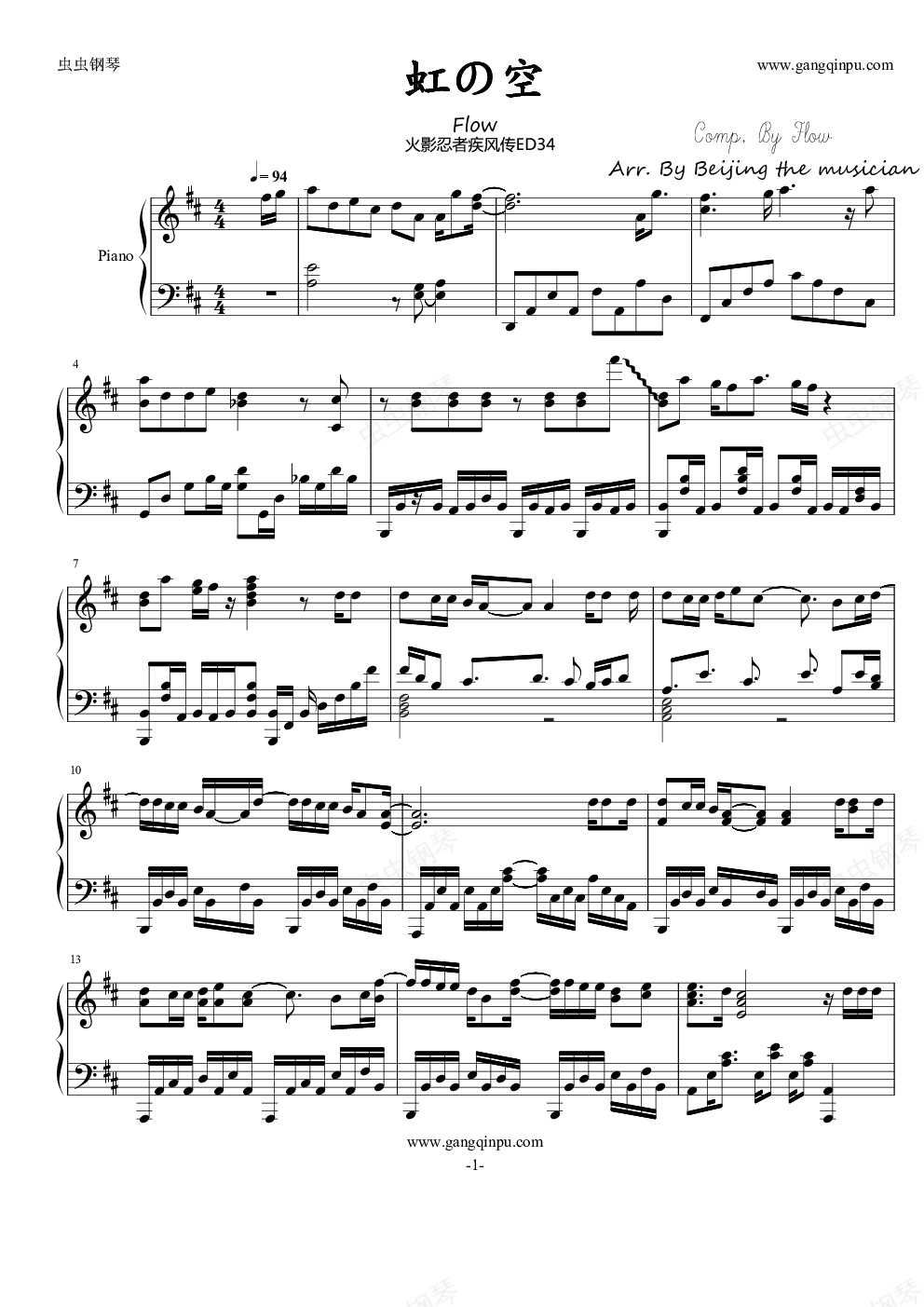 钢琴谱:火影忍者疾风传ED34《虹の空》-Flow