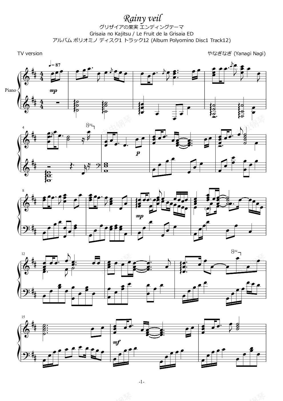 钢琴谱:灰色的果实ED Rainy veil (TV版)(Grisaia(Grizaia) no Kajitsu Le Fruit de la Grisaia グリザイアの果実)(