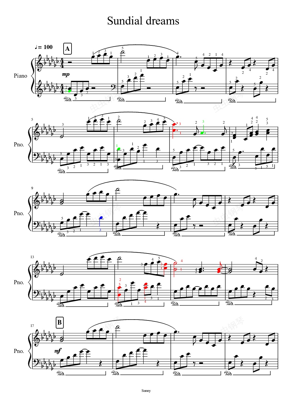 1.该乐谱为本人根据原版MV完美编配,没有降低难度,保证原汁原味,反复的地方也没有像大多数制谱者一样简单地复制粘贴,适合水平较高的钢琴爱好者以及本曲的狂热爱好者演奏。2.红色表示重要的音,绿色表示选弹音(难度较大或不是很重要),蓝色代表前后反复时不一致的地方,从我上传的MP3仔细听就知道反复的时候有一点微妙的区别哈!O(∩_∩)O*3.如果觉得这个Gb大调太难,可以改成G调,即可大幅降低难度(改调方法很简单,六个降号改成一个升号,升F,并且第40,44,88,92小节的还原D升高一个半音,改成D#;第46,94小节的还原C也升高一个半音,改成C#)*4.加入了参考指法!5.喜欢音乐的爱好者们请加QQ群