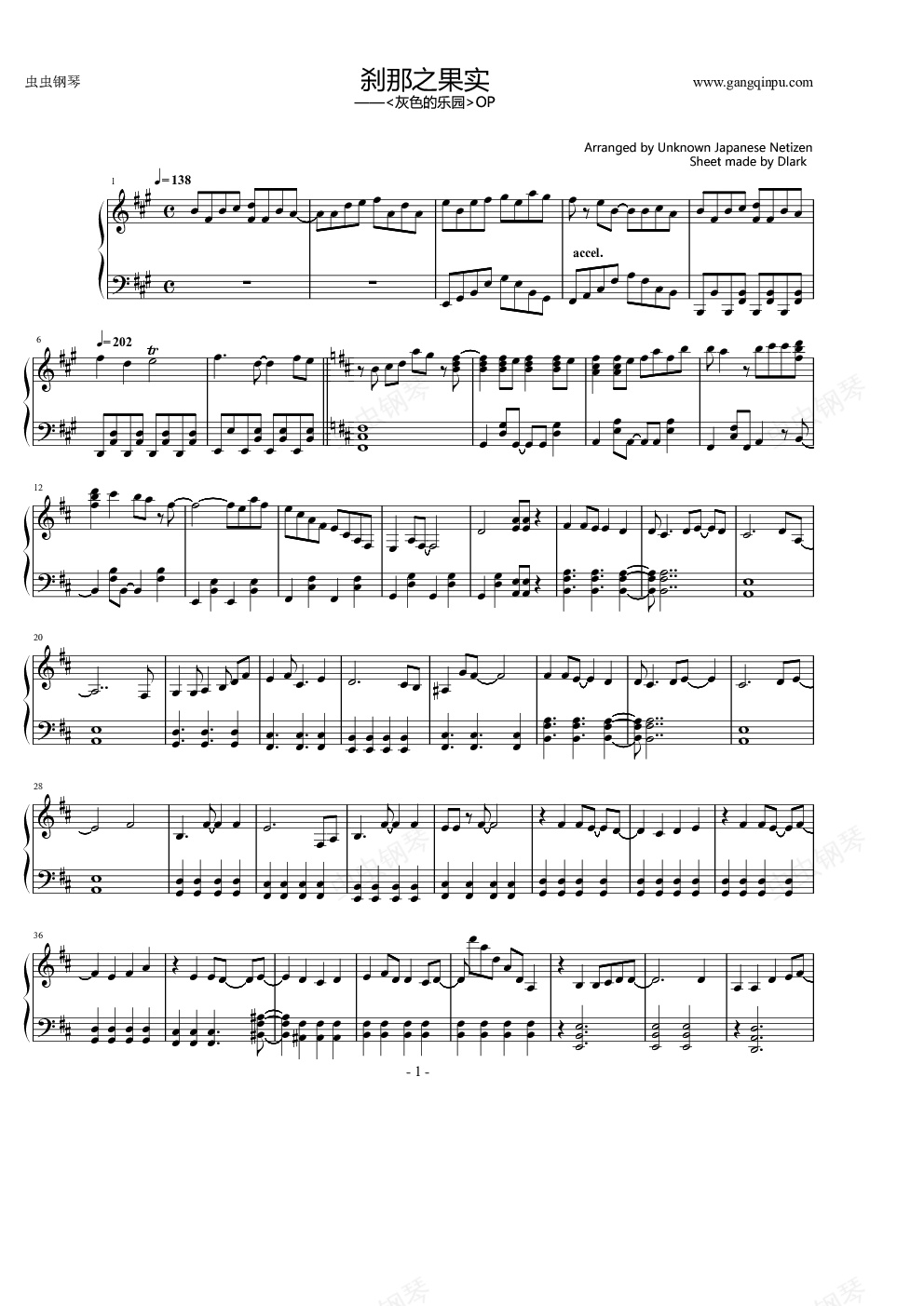 钢琴谱:【灰色的乐园】OP 刹那之果实